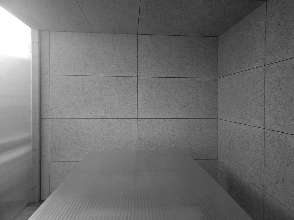 The office-part is elevated on plastic pallets and isolated with wooden fiber panels, giving it a soft interior and soft acoustics, like a nest. The atelier-part is industrial-rough and has a concrete floor with huge bench-table that can accommodate number of projects at same time and that can be reconfigured into different modules/shapes for different projects/needs.
