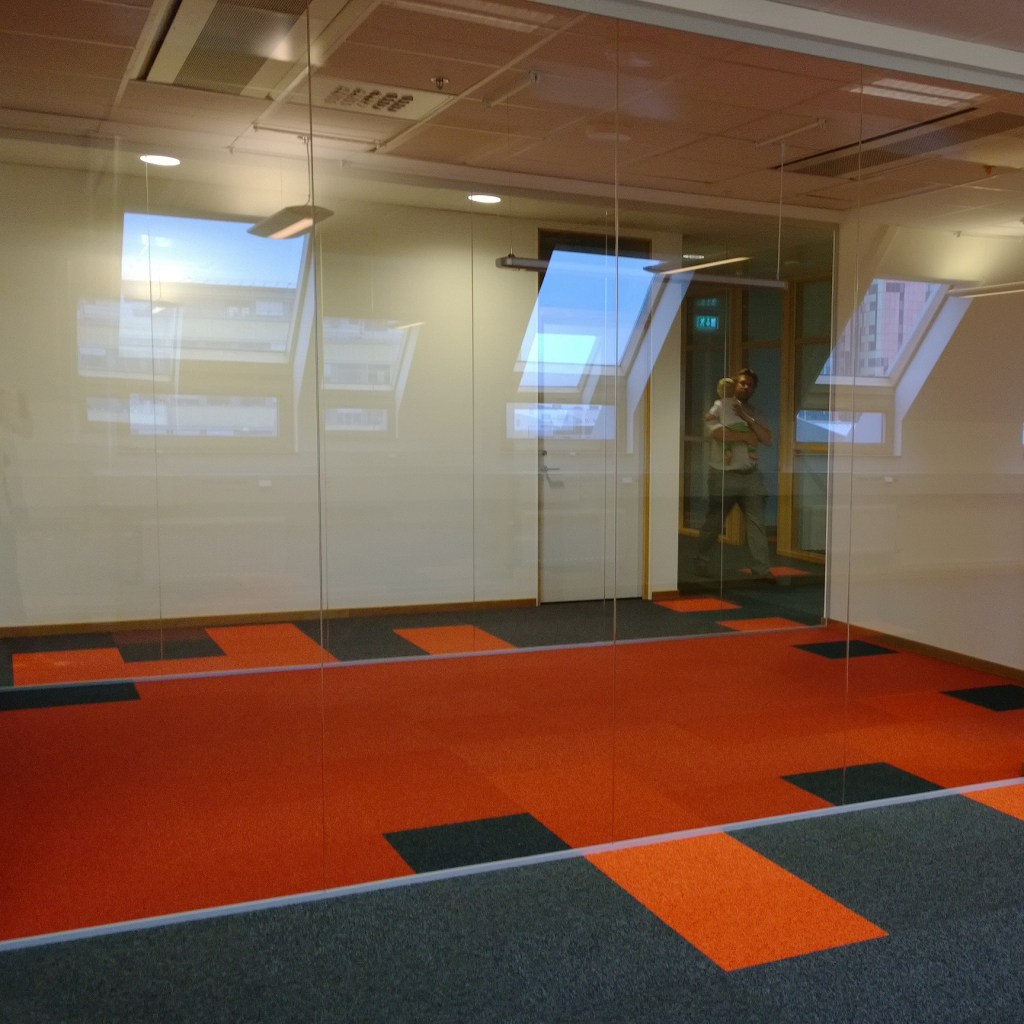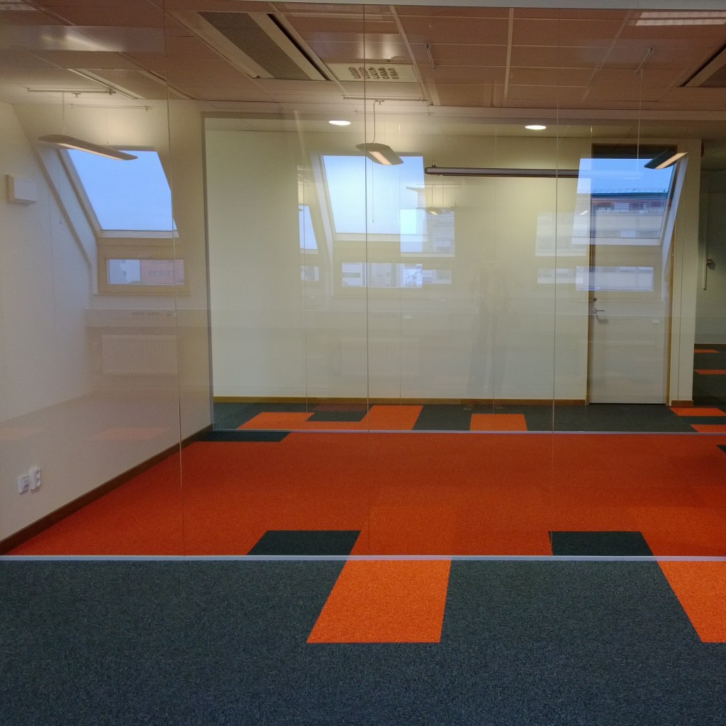 The main design tool was as simple as carefully patterned floor tiles: through the gray floors orange pattern breaks through. It is laid in three different densities: A) few dots at regular open office workspaces, calmer, B) intensive lava field in conference and meeting rooms as mark of active and energetic spaces that help to vitaminize oneself during few hours, and the C) in-between density in communication strokes mainly indicating the flow or movement.