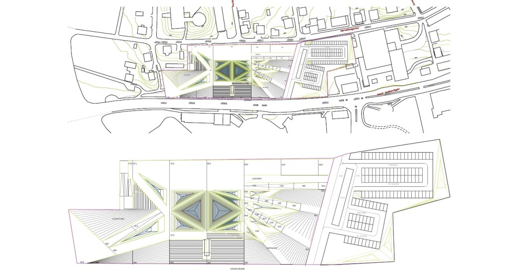 The parliament for the nomads. Parliament for space, wind, ice, snow, darkness, nightsky, fire, tent and the nomad. Building that is part of a wild, integrates with the wild, is a landscape itself. A statement of democracy is represented in multitude, in Many, many tents gathered together. The samic geometry and functionality, the symmetric, decorative and complicated patterns gave lines of organization for the system of tents, varying in size and function. The advantage of hillside site was used to integrate the building into nature, the top of the hill flows over the tents, forms roof gardens, makes it into a public space. The demand of usage of a wooden structure was turned into triangular framework of the tents.. SWE